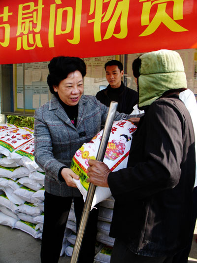 市人大副主任、市總工會主席劉遠(yuǎn)珍向貧困村民發(fā)放春節(jié)慰問物資