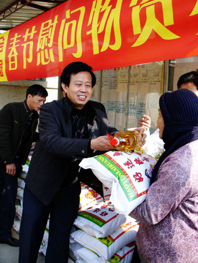 市建設(shè)局局長王德聲向貧困村民發(fā)放春節(jié)慰問物資