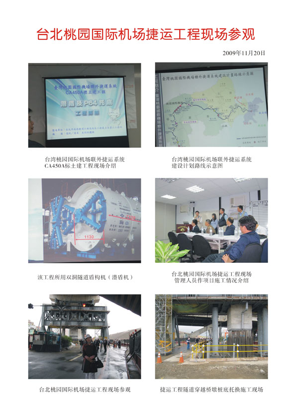 會(huì)議收錄了交通、隧道與地下工程等方面之調(diào)查、規(guī)劃、設(shè)計(jì)、分析研究、施工、管理、監(jiān)測(cè)、檢測(cè)、環(huán)境保護(hù),隧道與地下工程運(yùn)營(yíng)、防災(zāi)、工程實(shí)例介紹以及展望等方面的文章共100多篇。進(jìn)行了為期兩天的學(xué)術(shù)報(bào)告和學(xué)術(shù)交流。會(huì)議安排了3個(gè)專題報(bào)告和50個(gè)學(xué)術(shù)報(bào)告。會(huì)后組織與會(huì)代表們參觀了施工中的桃園國(guó)際機(jī)場(chǎng)聯(lián)外捷運(yùn)系統(tǒng)(至臺(tái)北站)工程。