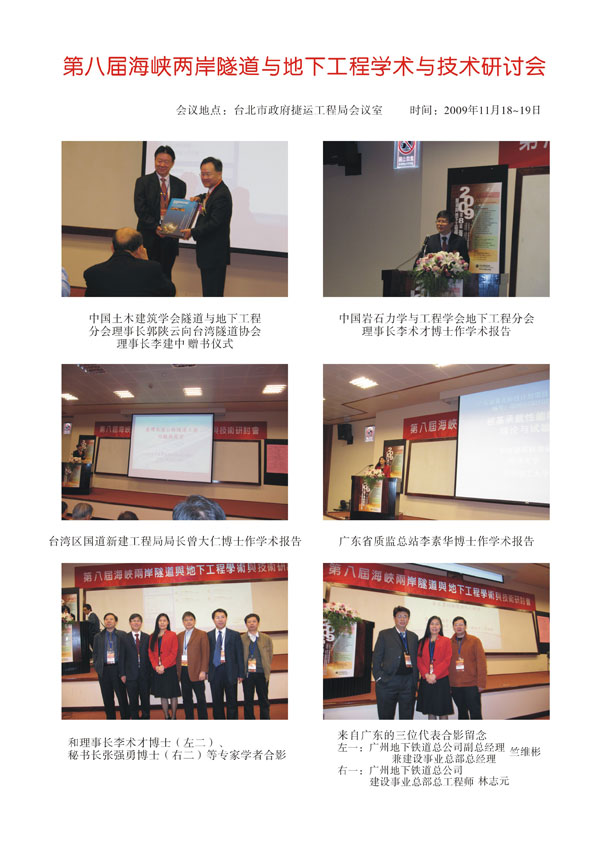 瀏覽次數(shù):1627第八屆海峽兩岸隧道與地下工程學(xué)術(shù)與技術(shù)研討會(huì)于2009年11月17日至20日在中國(guó)臺(tái)灣臺(tái)北市政府捷運(yùn)工程局隆重召開(kāi),會(huì)議的宗旨是對(duì)大陸和臺(tái)灣近年來(lái)隧道與地下工程的調(diào)查、規(guī)劃、設(shè)計(jì)、研究、施工、管理、監(jiān)測(cè)、檢測(cè)、災(zāi)害防治、風(fēng)險(xiǎn)控制、環(huán)境保護(hù)等方面的新技術(shù)及最新研究成果進(jìn)行展示和交流,對(duì)存在的相關(guān)問(wèn)題進(jìn)行探討,以促進(jìn)全國(guó)隧道與地下工程學(xué)術(shù)與技術(shù)水平的提高,加強(qiáng)海峽兩岸學(xué)術(shù)和技術(shù)交流。會(huì)議由中國(guó)巖石力學(xué)與工程學(xué)會(huì)地下工程分會(huì)、中國(guó)土木工程學(xué)會(huì)隧道與地下工程分會(huì)和臺(tái)灣隧道協(xié)會(huì)聯(lián)合主辦,財(cái)政法人中興工程顧問(wèn)社承辦,由臺(tái)灣交通部高速鐵路工程局、臺(tái)北市政府捷運(yùn)工程局、交通部臺(tái)灣區(qū)國(guó)道新建工程局等22家單位協(xié)辦。