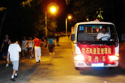 一是加強(qiáng)山林防火宣傳。風(fēng)景區(qū)在夜間出動(dòng)防火宣傳車,一方面進(jìn)行森林火險(xiǎn)的巡查,以便及時(shí)發(fā)現(xiàn)火情;一方面進(jìn)行森林防火宣傳,巡回重復(fù)播放森林防火法律法規(guī)和防火宣傳口號(hào),勸阻游客不在景區(qū)內(nèi)吸煙及使用明火烹茶等威脅山林防火安全的行為。