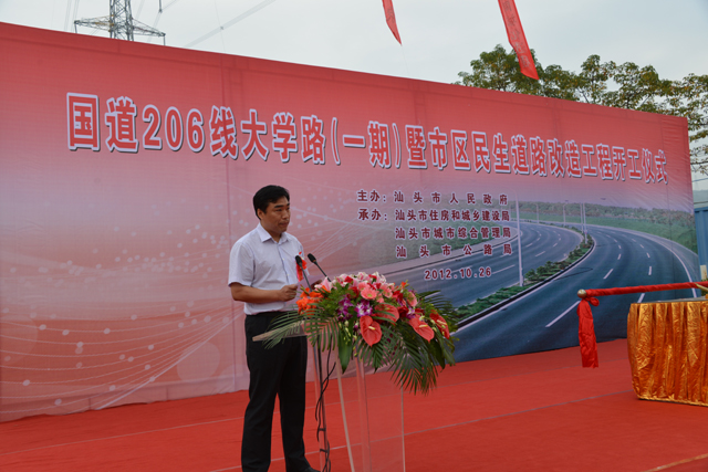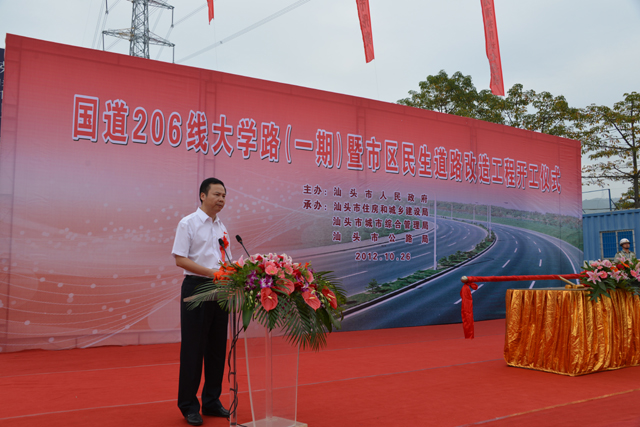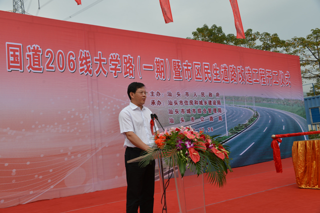 瀏覽次數(shù):1819今天上午,由市委、市政府舉辦,市住建局、城管局、公路局承辦的國道206線大學路暨市區(qū)民生道路改造工程開工儀式,在大學路收費站廣場舉行。市委書記李鋒、市長鄭人豪、市政協(xié)主席郭大欽、市人大常務副主任黃俊潮、市委常委、常務副市長鄭通聲、市委常委張應杰、汕頭警備區(qū)政委胡世軍、市政協(xié)副主席謝鏗、市紀委副書記、監(jiān)察局局長宋榮生出席儀式并推動吉祥桿。市長鄭人豪作重要講話。儀式由副市長李耿堅主持。