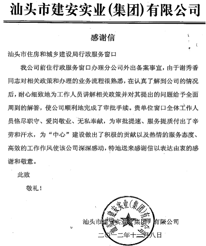 近日,市住建局駐服務(wù)中心窗口收到來(lái)自汕頭市建安實(shí)業(yè)(集團(tuán))有限公司的一封感謝信,對(duì)局服務(wù)窗口在工作中表現(xiàn)出的業(yè)務(wù)能力和服務(wù)熱情表示感謝。