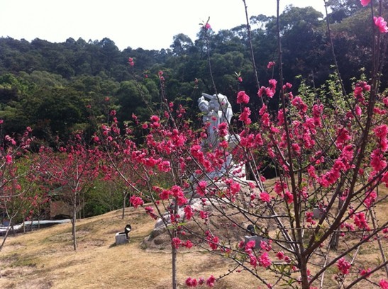 礐石的桃花有別于他處,2010年,礐石風(fēng)景區(qū)對桃花澗進(jìn)行了桃林優(yōu)化改造,栽植了一批來自桃花故鄉(xiāng)——江浙的桃花品種。與本地品種的桃花相比,其具有葉翠、花大、色紅、重瓣、花期長且準(zhǔn)的特點(diǎn),特別是在今年氣溫偏暖的條件下,這批落戶景區(qū)的“江南美女”依然比本地桃花的花期稍遲,仿佛在等待最適合最絢爛的時(shí)刻。經(jīng)過景區(qū)工作人員三年的精心培育和養(yǎng)護(hù),“姍姍來遲”的桃花依約在沐陽中次第開放,讓春季踏青的賞花人又有了新去處。