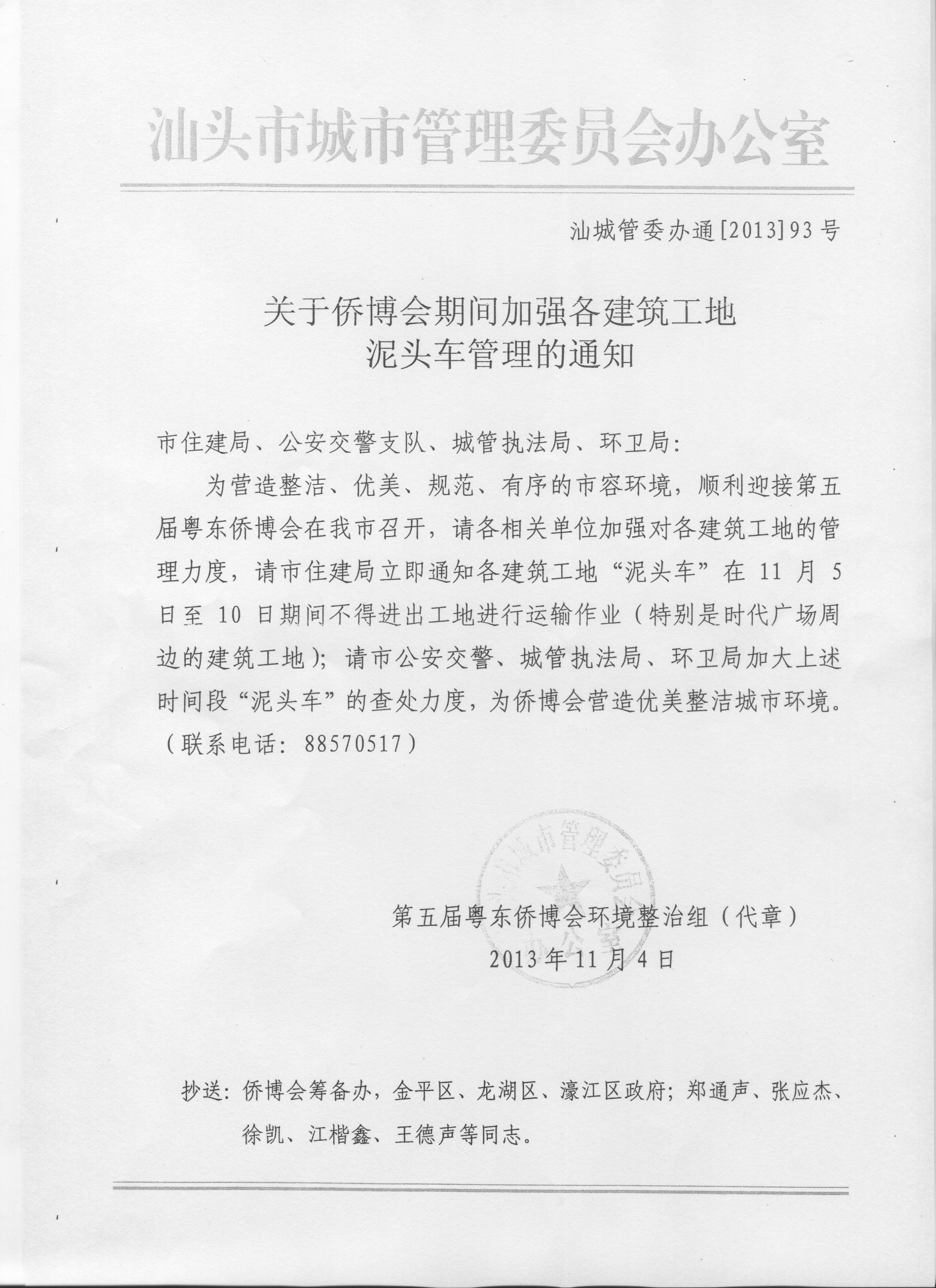 附件:關(guān)于僑博會期間加強各建筑工地泥頭車管理的通知(汕城管委辦通[2013]93號)