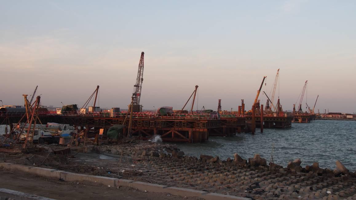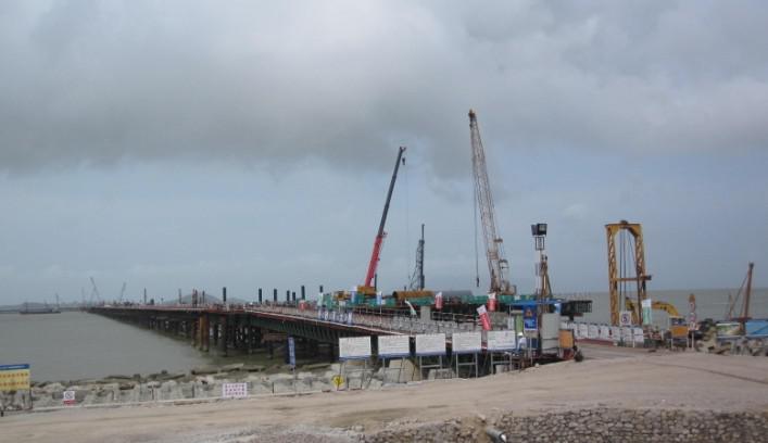 在各參建單位和市質(zhì)監(jiān)站的共同努力下,東海岸新城市政項目進展順利。截止目前,外砂河大橋主橋及引橋樁基累計完成257根灌注樁施工,累計沉放鋼護筒221根,鋼棧橋全部完成,累計完成7個系梁、13個承臺、39根立柱和12個蓋梁的混凝土澆筑;新津河大橋樁基累計完成198根灌注樁施工,累計完成鋼護筒226根,平臺鋼管樁124根,3#墩右幅承臺開始澆筑混凝土;新津片區(qū)中山東路延長段已完成砼路面施工,正在進行綠化工程施工及路燈安裝,1#橋已完成所有樁基以及空心板梁的制作,正進行墩柱蓋梁以及支座施工,濱江大道經(jīng)二路正在進行軟基處理施工。