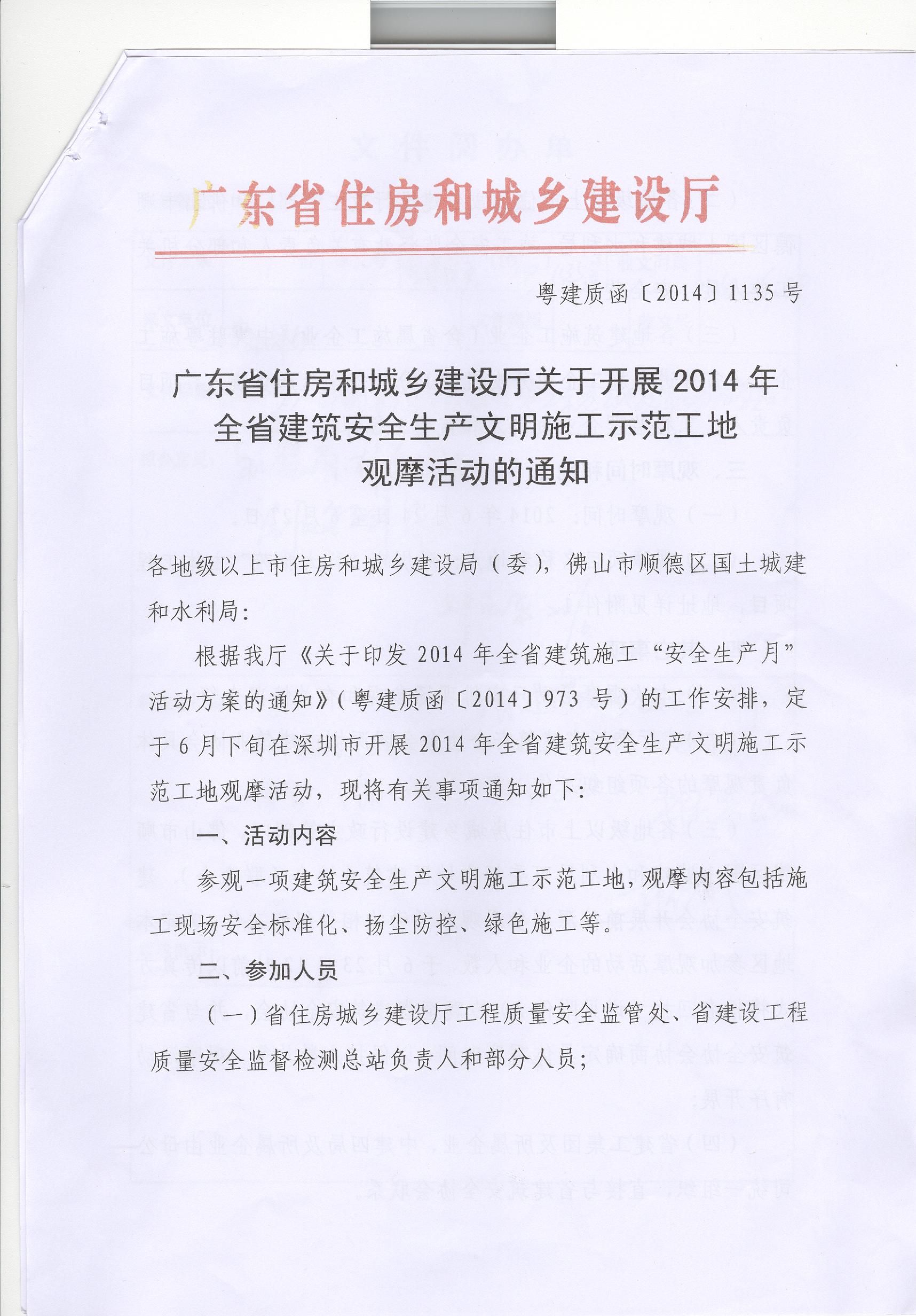 廣東省住房和城鄉(xiāng)建設(shè)廳關(guān)于開展2014年全省建筑安全生產(chǎn)文明施工示范工地觀摩活動(dòng)的通知