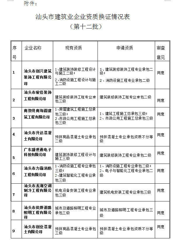 關(guān)于建筑業(yè)企業(yè)資質(zhì)換證審查意見的公示(第十二批)汕住建公示 [2016]40號(hào)