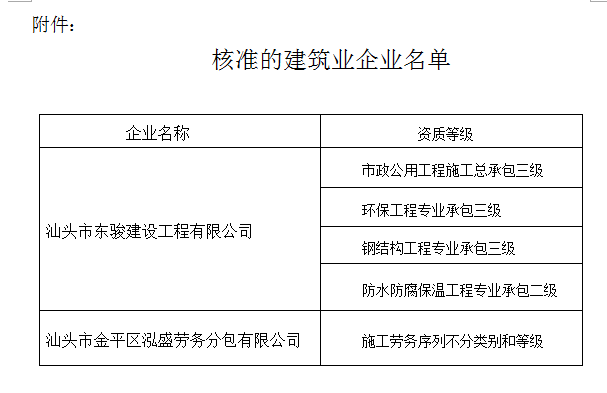 根據(jù)《中華人民共和國行政許可法》、《中華人民共和國建筑法》和有關(guān)建設(shè)工程企業(yè)資質(zhì)管理規(guī)定,現(xiàn)將經(jīng)我局審查核準(zhǔn)的建筑業(yè)企業(yè)名單予以公布(見附件)。