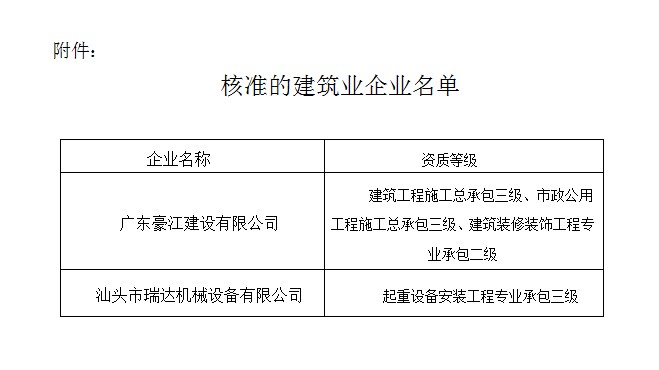 根據(jù)《中華人民共和國行政許可法》、《中華人民共和國建筑法》和有關(guān)建設(shè)工程企業(yè)資質(zhì)管理規(guī)定,現(xiàn)將經(jīng)我局審查核準的建筑業(yè)企業(yè)名單予以公布(見附件)。