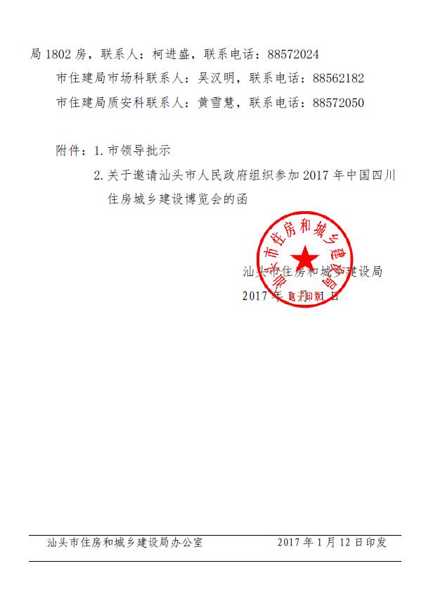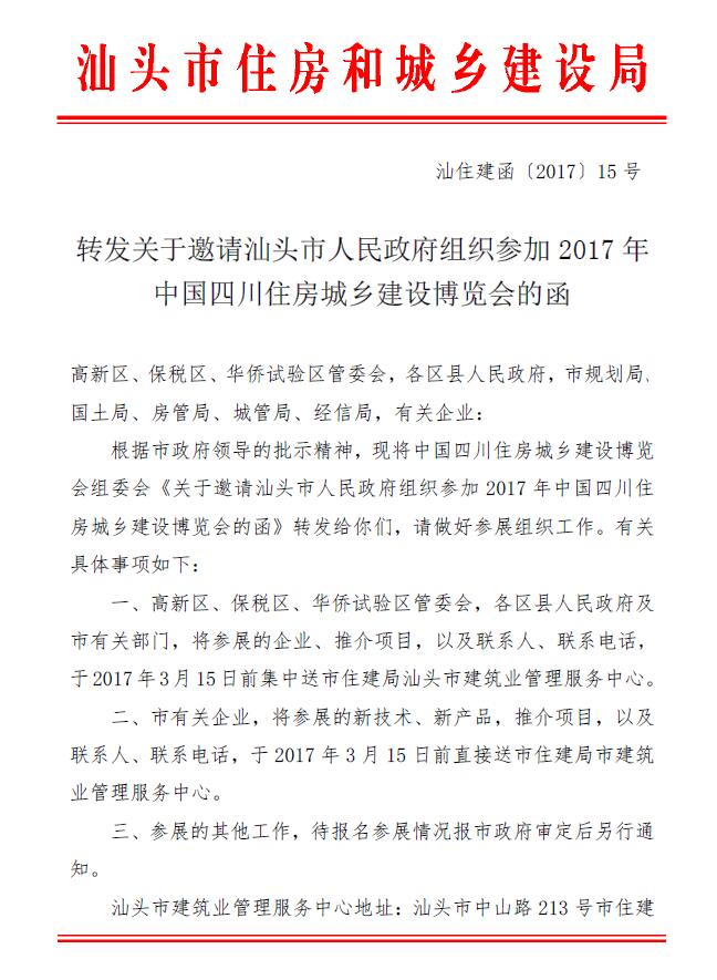 轉(zhuǎn)發(fā)關(guān)于邀請汕頭市人民政府組織參加 2017 年中國四川住房城鄉(xiāng)建設(shè)博覽會的函汕住建函〔2017〕15 號