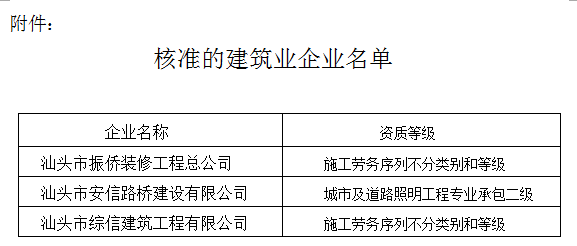 根據(jù)《中華人民共和國行政許可法》、《中華人民共和國建筑法》和有關(guān)建設(shè)工程企業(yè)資質(zhì)管理規(guī)定,現(xiàn)將經(jīng)我局審查核準的建筑業(yè)企業(yè)名單予以公布(見附件)。 特此公告。