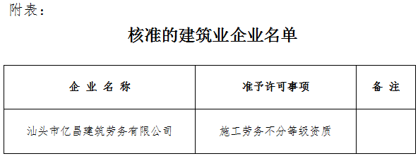 根據(jù)《中華人民共和國行政許可法》、《中華人民共和國建筑法》和有關(guān)建設(shè)工程企業(yè)資質(zhì)管理規(guī)定,現(xiàn)將經(jīng)我局審查核準(zhǔn)的建筑業(yè)企業(yè)名單予以公布(見附表)。 特此公告。