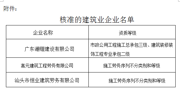根據(jù)《中華人民共和國行政許可法》、《中華人民共和國建筑法》和有關(guān)建設(shè)工程企業(yè)資質(zhì)管理規(guī)定,現(xiàn)將經(jīng)我局審查核準(zhǔn)的廣東潮鍇建設(shè)有限公司等三家建筑業(yè)企業(yè)名單予以公布(見附件)。 特此公告。