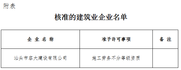 根據(jù)《中華人民共和國行政許可法》、《中華人民共和國建筑法》和有關(guān)建設(shè)工程企業(yè)資質(zhì)管理規(guī)定,現(xiàn)將經(jīng)我局審查核準(zhǔn)的建筑業(yè)企業(yè)名單予以公布(見附表)。 特此公告。
