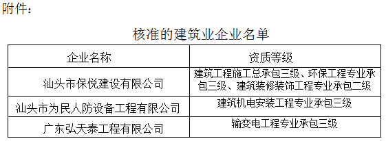 根據(jù)《中華人民共和國(guó)行政許可法》、《中華人民共和國(guó)建筑法》和有關(guān)建設(shè)工程企業(yè)資質(zhì)管理規(guī)定,現(xiàn)將經(jīng)我局審查核準(zhǔn)的汕頭市保悅建設(shè)有限公司等三家建筑業(yè)企業(yè)名單予以公布(見(jiàn)附件)。