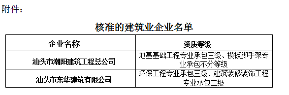 根據(jù)《中華人民共和國(guó)行政許可法》、《中華人民共和國(guó)建筑法》和有關(guān)建設(shè)工程企業(yè)資質(zhì)管理規(guī)定,現(xiàn)將經(jīng)我局審查核準(zhǔn)的汕頭市潮陽(yáng)建筑工程總公司等二家建筑業(yè)企業(yè)名單予以公布(見(jiàn)附件)。