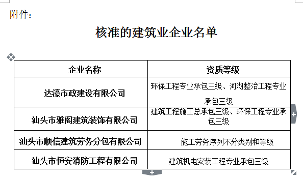 根據(jù)《中華人民共和國行政許可法》、《中華人民共和國建筑法》和有關(guān)建設(shè)工程企業(yè)資質(zhì)管理規(guī)定,現(xiàn)將經(jīng)我局審查核準(zhǔn)的達(dá)濠市政建設(shè)有限公司等四家建筑業(yè)企業(yè)名單予以公布(見附件)。