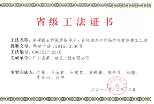 孤石群地質(zhì)條件下大直徑灌注樁同軸異徑旋挖施工技術(shù)》,并形成省級(jí)工法。