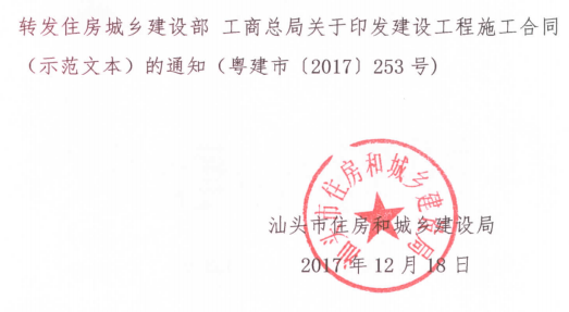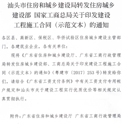 汕頭市住房和城鄉(xiāng)建設(shè)局轉(zhuǎn)發(fā)住房城鄉(xiāng)建設(shè)部 國家工商總局關(guān)于印發(fā)建設(shè)工程施工合同(示范文本)的通知汕住建通[2017]333號