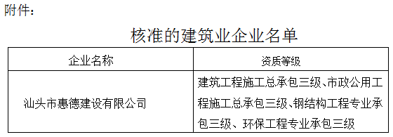 根據(jù)《中華人民共和國行政許可法》、《中華人民共和國建筑法》和有關(guān)建設(shè)工程企業(yè)資質(zhì)管理規(guī)定,現(xiàn)將經(jīng)我局審查核準的建筑業(yè)企業(yè)名單予以公布(見附件)。