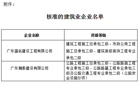 瀏覽次數(shù):4320根據(jù)《中華人民共和國(guó)行政許可法》、《中華人民共和國(guó)建筑法》和有關(guān)建設(shè)工程企業(yè)資質(zhì)管理規(guī)定,現(xiàn)將經(jīng)我局審查核準(zhǔn)的廣東盛名建設(shè)工程有限公司等二家建筑業(yè)企業(yè)名單予以公布(見(jiàn)附件)。