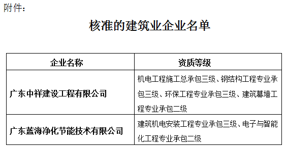 根據(jù)《中華人民共和國行政許可法》、《中華人民共和國建筑法》和有關(guān)建設(shè)工程企業(yè)資質(zhì)管理規(guī)定,現(xiàn)將經(jīng)我局審查核準(zhǔn)的廣東中祥建筑工程有限公司等二家企業(yè)予以公布(見附件)。