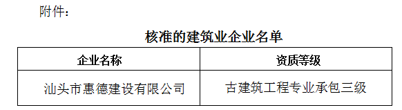 根據(jù)《中華人民共和國(guó)行政許可法》、《中華人民共和國(guó)建筑法》和有關(guān)建設(shè)工程企業(yè)資質(zhì)管理規(guī)定,現(xiàn)將經(jīng)我局審查核準(zhǔn)的建筑業(yè)企業(yè)名單予以公布(見附件)。