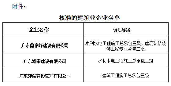 瀏覽次數(shù):4237根據(jù)《中華人民共和國(guó)行政許可法》、《中華人民共和國(guó)建筑法》和有關(guān)建設(shè)工程企業(yè)資質(zhì)管理規(guī)定,現(xiàn)將經(jīng)我局審查核準(zhǔn)的廣東鼎泰峰建設(shè)有限公司等三家建筑業(yè)企業(yè)名單予以公布(見(jiàn)附件)。