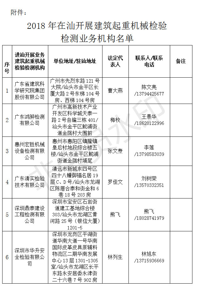 附件:2018年在汕開展建筑起重機械檢驗檢測業(yè)務(wù)機構(gòu)名單