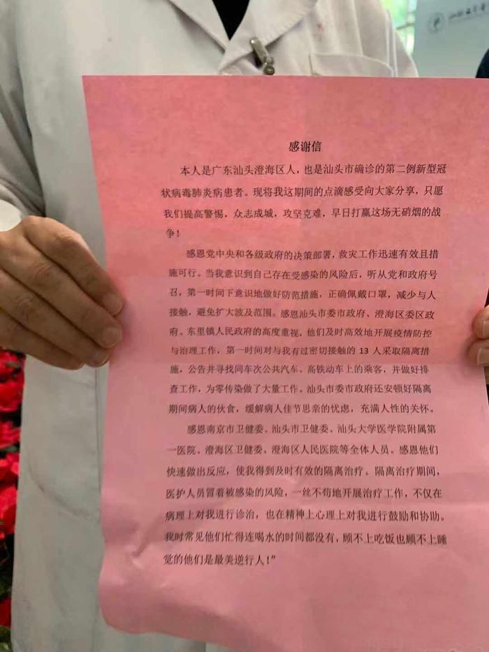 從確診到治愈出院,汕大附一院醫(yī)護(hù)人員冒著被感染的風(fēng)險(xiǎn),一絲不茍地開(kāi)展治療工作,沈先生非常感動(dòng),寫下了一封《感謝信》。沈先生為自己給大家?guī)?lái)的麻煩感到抱歉。他也呼吁大家不要因?yàn)檫@個(gè)病毒感到恐慌,主動(dòng)防范,積極面對(duì),做好戴口罩等措施。他還說(shuō),醫(yī)護(hù)人員給了自己很多信心,給了自己很多關(guān)懷,讓自己心態(tài)變得積極。他在出院后最想做的事情,就是希望有機(jī)會(huì)能以身說(shuō)法,呼吁大家一起來(lái)抗擊疫情。