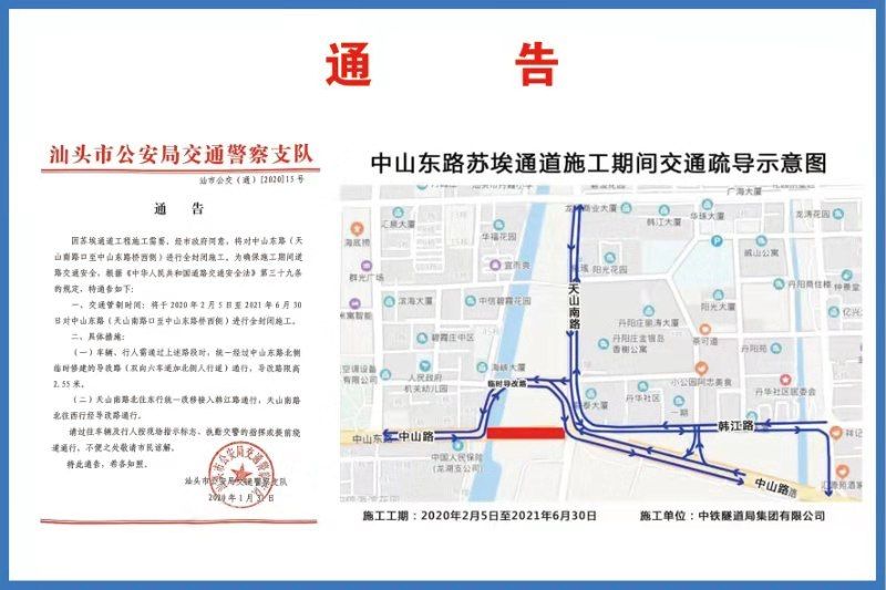 近日,市公安交警支隊發(fā)布公告,因汕頭海灣隧道北岸施工需要,中山東路(天山南路口至中山東路橋西側(cè))路段從2020年2月5日起到2021年6月30日實施封閉施工,過往車輛需要繞行中山東路北側(cè)臨時修建的導(dǎo)改路。受疫情防控影響,施工單位中鐵隧道局汕頭海灣隧道北岸工區(qū)將這一封閉繞行措施推遲到明天(2月13日)凌晨零點起實行。