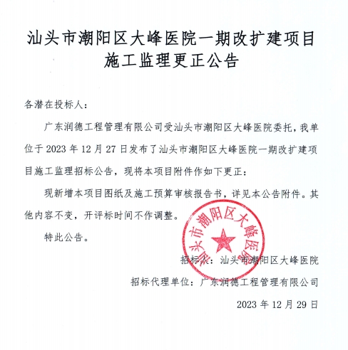 汕頭市潮陽區(qū)大峰醫(yī)院一期改擴(kuò)建項(xiàng)目施工監(jiān)理%>