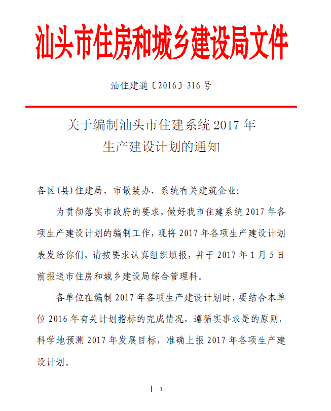 關(guān)于編制汕頭市住建系統(tǒng)2017年生產(chǎn)建設(shè)計劃的通知