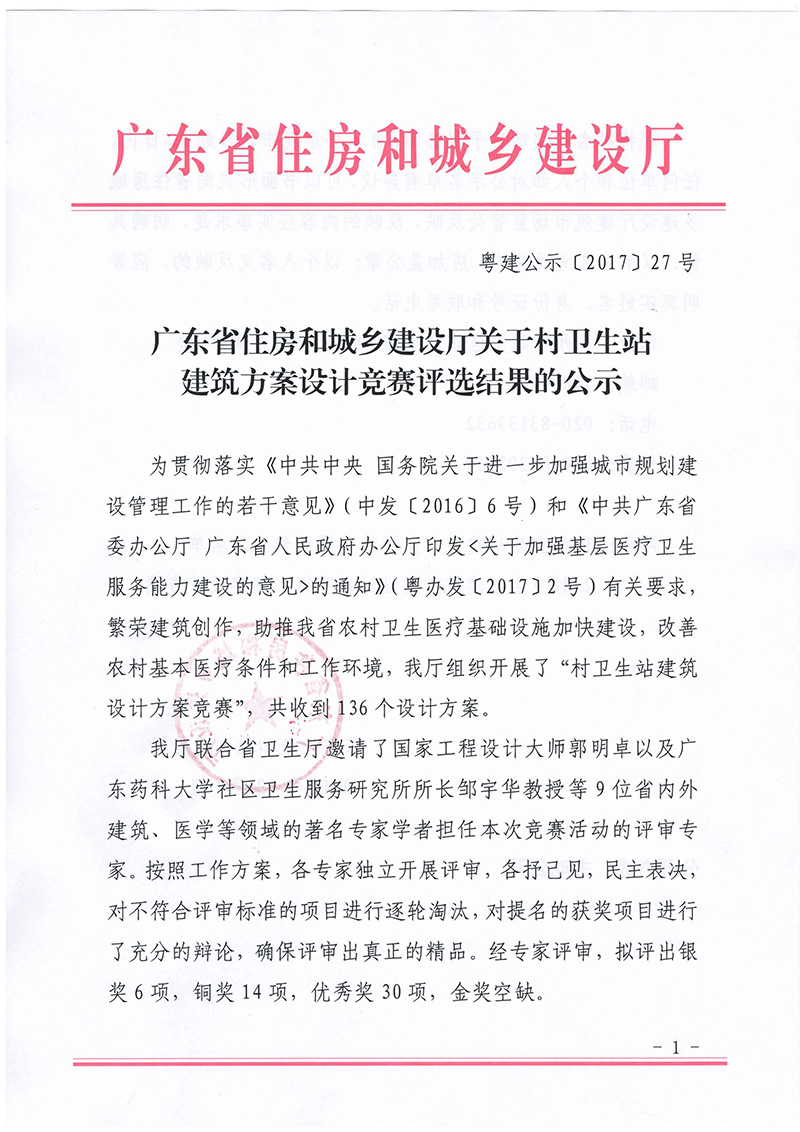 廣東省住房和城鄉(xiāng)建設(shè)廳關(guān)于村衛(wèi)生站建筑方案設(shè)計(jì)競(jìng)賽評(píng)選結(jié)果的公示