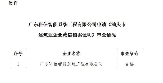 附件:廣東科信智能系統(tǒng)工程有限公司申請(qǐng)《汕頭市建筑業(yè)企業(yè)誠(chéng)信檔案證明》審查情況
