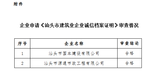 關(guān)于公布企業(yè)申請(qǐng)《汕頭市建筑業(yè)企業(yè)誠信檔案證明》審查情況的通知