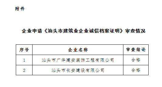 關(guān)于公布企業(yè)申請(qǐng)《汕頭市建筑業(yè)企業(yè)誠信檔案證明》審查情況的通知