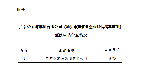關(guān)于公布廣東金東海集團有限公司《汕頭市建筑業(yè)企業(yè)誠信檔案證明》延續(xù)申請審查情況的通知